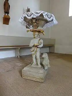 Der Taufstein aus dem 17. Jahrhundert war nach dem Zweiten Weltkrieg zunächst verschollen und wurde bei Ausgrabungen 1949 wiederentdeckt. Er zeigt Johannes den Täufer als Kind. Zu seinen Füßen sitzt ein Lamm ohne Ohren. Das Kind trägt die achteckige Taufschale, unter der das Wappen des Kirchenpatronats zu sehen ist. In seiner rechten Hand hält er eine Bibel, aus der er vorliest.