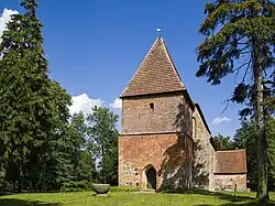 Der dendrochronologisch auf 1433d[1] datierte Westturm auf quadratischem Grundriss ist mit einem Pyramidendach geschlossen. Am Westturm befindet sich eine Einzeiger-Uhr. Um 1500 wurde eine Vorhalle aus Feld- und Backstein mit einem Blendengiebel im Süden angebaut.