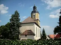 Die Kirche ist eine Chorturmanlage im ummauerten Kirchhof des Ortes. Vom ehemaligen romanischen Bau sind die Unterteile des Turms sowie die reich profilierten Rundbogenfenster im Anbau auf der Nordseite erhalten geblieben. Die im Chorbogen befindliche Jahreszahl 1792 weist auf den Neubau in dieser Zeit hin.