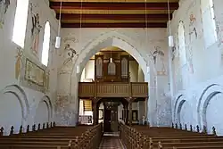 Die Reste einer Abendmahldarstellung aus dem 14. Jahrhundert wurde an der Chorsüdseite freigelegt. An der Nordwand des Schiffes wurden Darstellungen des Christophorus und des Georg aus der Zeit um 1400 gefunden. An der Ostwand des Schiffes und im Obergaden sind Darstellungen der Apostel zu sehen, sie wurden in der zweiten Hälfte des 17. Jahrhunderts gemalt. Die gemalten Wandbehänge und die Engel im Chor stammen aus derselben Zeit.