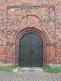 Westportal mit Überfang-Blendbogen und Backsteinmuster