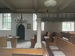 Der Kanzelaltar stammt aus dem Jahr 1883, besitzt aber eine ältere Rahmung. In der Predella ist das Abendmahl Jesu abgebildet. Zur weiteren Kirchenausstattung gehören eine pokalförmige, spätgotische Fünte sowie eine Hufeisenempore aus dem Jahr 1883. Das Bauwerk ist in seinem Innern flach gedeckt.