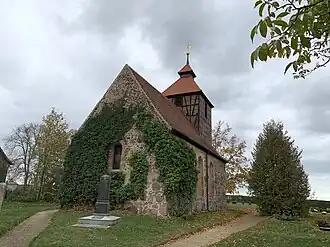 Das Bauwerk entstand im Wesentlichen aus unbehauenen und nicht lagig geschichteten Feldsteinen, Mauersteinen sowie Mischmauerwerk. Der Chor ist gerade und nicht eingezogen. Mittig ist ein rundbogenförmiges Fenster, dessen Fasche aus rötlichem Mauerstein erstellt wurde und daher vermutlich nicht bauzeitlich ist. Im Giebel ist eine kleine und hochrechteckige Öffnung.