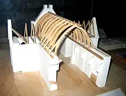 Eine bautechnikgeschichtliche Besonderheit ist das aus der Erbauungszeit erhaltene, bogenförmige Bohlendach über dem Kirchenschiff. Die Dachkonstruktion formt gleichzeitig das innen sichtbare hölzerne Spitztonnen-Gewölbe, das mit aufstuckierten Rippen verziert ist.[4]