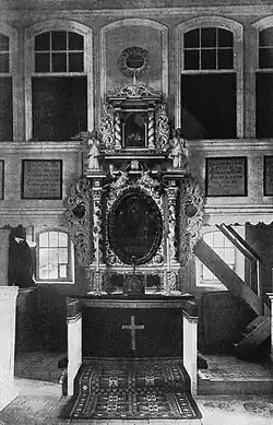 Der Innenraum des Langhauses ist mit einer Flachdecke überspannt. Auf der im Westen im ersten Drittel des 18. Jahrhunderts eingebauten Empore steht die 1883 gebaute Orgel. Im Chor befinden sich die Reste einer Patronatsloge. Zur Kirchenausstattung gehören ein zweigeschossiger, mit Säulen gerahmter Altar von 1721, auf dessen Predella das Abendmahl dargestellt ist, und eine Kanzel mit einem Schalldeckel aus demselben Jahr.