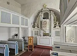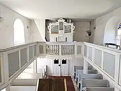 Über dem Kanzelaltar mit dem verzierten Kanzelkorb befindet sich der Triumphbogen mit dem Tetragramm. Ein Taufengel mit Taufschale und das einfache Gestühl komplettieren den Saal sowie die hufeisenförmigen Emporen.