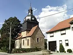 An den wuchtigen querrechteckigen Kirchturm, der durch Strebepfeiler von außen gestützt ist, ist auf einer Seite ein schmales Langhaus (mit der Jahreszahl 1620) und auf der anderen ein gotischer Chor mit hohem Satteldach und flachem Ostabschluss angebaut. Das Schiefergeschoss trägt eine achtseitige Schweifhaube mit Laterne und kleinem Spitzhelm.