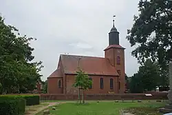 Die Kirche ist ein spätgotischer Saalbau aus Backstein in retrospektiver Formensprache mit halbkreisförmiger Apsis, der nach dendrochronologischer Datierung 1455 (d) (Ankerhölzer am Giebel) unter dem Kirchenpatronat derer von Quitzow erbaut wurde. Nach dem Aussterben der von Quitzows übernahm die Adelsfamilie derer von Grumbkow Dorf und Kirchenpatronat. Sie ließen das Bauwerk im Jahr 1722 barock überformen (Inschrift, Dachwerk von 1733 d) und um den massiven, eingezogenen Westturm erweitern. Eine erneute Umgestaltung erfolgte durch die Familie von Jagow in den Jahren 1843 und 1887–1990. Eine Restaurierung erfolgte im Jahr 1961. An der Südseite ist ein Bauteil mit Patronatsloge aus dem 18. Jahrhundert angebaut. Das Schiff ist flachgedeckt; in der Apsiskalotte findet sich eine spätgotische Malerei mit einer Darstellung des Weltgerichts mit mehreren Wappen, die 1890 stark restauriert wurde.