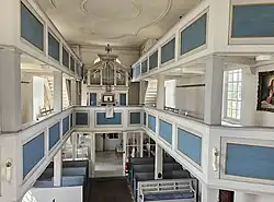 Das Kirchenschiff ist ein rechteckiger Saalbau mit zwei übereinanderliegenden umlaufenden Emporen. In dem von einer Stuckdecke überspannten Saal befindet sich ein Kanzelaltar im Stil des Rokoko mit ersten klassizistischen Anklängen. Über antikisierenden Säulen erscheint ein Tetragramm umgeben vom Strahlenkranz zwischen zwei Flammenvasen. Darunter auf dem Kanzeldeckel die Gesetzestafeln des Mose. Eine Taufe mit aufwändigen floralen Schnitzereien gehört zur Ausstattung. Der rechts an den Altaraufbau sich anschließende Rittergutsstand und die links sich anschließende Sakristei wurden Mitte des 20. Jahrhunderts entfernt.[2] In der nördlichen Empore hängt ein früheres Altarbild mit einer Darstellung von "Christus Brot und Wein segnend". Dabei handelt es sich um eine um 1857 entstandene Kopie des berühmten Gemäldes von Carlo Dolci aus der Dresdner Gemäldegalerie Alte Meister.