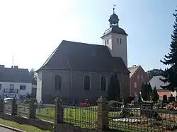 Die Kirche ist ein Saalbau mit dreiseitigem Ostschluss, der im Kern aus der Zeit um 1300 oder dem 14. Jahrhundert stammt. Ein halb eingezogener quadratischer Westturm aus verputztem Fachwerk mit geschweifter Haube und Laterne, wohl vom Ende des 18. Jahrhunderts, akzentuiert das Bauwerk. An der Südseite erschließt ein segmentbogiges Sandsteinportal mit der Jahreszahl 1561 im Schlussstein das Bauwerk. Im Jahr 1622 wurde die Kirche unter dem Patronat der Löser auf Pretzsch renoviert; eine Restaurierung erfolgte im Jahr 1966.