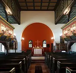 Ein Triumphbogen trennt den Besucherraum von der Altarapsis, die gegenüber dem Hauptraum um drei Stufen erhöht ist. Die Fläche des Bogens ist geweißt, eine ähnliche Rundbogenform wiederholt sich auf der westlichen Empore und umrahmt den Orgelprospekt.