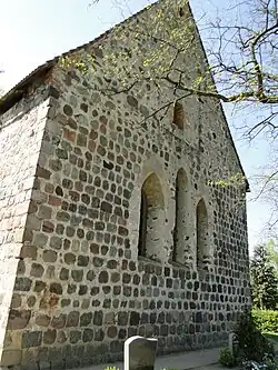 Der Feldsteinquaderbau aus der zweiten Hälfte des 13. Jahrhunderts war ehemals turmlos. Im 15. Jahrhundert wurde ein gegen das Schiff eingezogener rechtwinkliger Turm mit einem Innenmaß von 3,3 m × 5,8 m und einer Mauerstärke von 1,5 m aus Feldsteinquadern bis über die Dachtraufe und dann ein quadratischer Fachwerkschaft mit ausgemauerten gefugten Fächern westlich vorgebaut, der mit einem Zeltdach aus Ziegeln gedeckt ist. Im Turm befindet sich eine hölzerne Treppe zum Glockenstuhl und auf den Kirchboden. Der Glockenstuhl kann auch durch ein Granitportal an der Südseite über eine Treppe mit steigender Kappe aus Feldsteinen auf Schalung überwölbt und in der südlichen Turmmauer gelegen, erreicht werden.