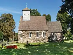 Die Feldsteinkirche wurde Mitte des 13. Jahrhunderts erbaut. Sie besteht aus einem Langhaus, einem eingezogenen rechteckigen Chor und einer Sakristei an dessen Nordwand, an die nach Westen ein Anbau angefügt wurde, hinter dessen Portal sich ein Vestibül verbirgt. Der Anbau verdeckt die Priesterpforte. Dem Satteldach des Langhauses wurde 1771 im Westen ein quadratischer Dachreiter aufgesetzt, der den Glockenstuhl beherbergt und mit einem Pyramidendach bedeckt ist.