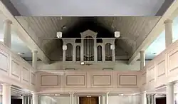 Obwohl der Kirchenraum nicht besonders groß und hoch ist, erhielt er eine dreiseitige Empore. Diese ruht auf runden Säulen und ihre Balustrade ist cremefarbig gestrichen sowie mit zart grau umrandeten rechteckigen Tafeln geschmückt.[6]