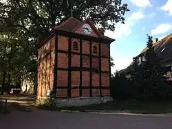 Glockenschauer, im Hintergrund Dorfkirche, Ansicht von Osten
