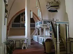 Die Kanzel mit Aufgang und Schalldeckel, das Gestühl sowie das Kruzifix stammen ebenfalls aus dem 18. Jahrhundert, die Taufschale aus der Zeit um 1652.