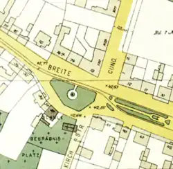 Der Großteil der Grünanlage mit dem nicht mehr als zeitgemäß erachteten Denkmal ist der Verbreiterung der Fahrbahnen in der Nachkriegszeit gewichen.