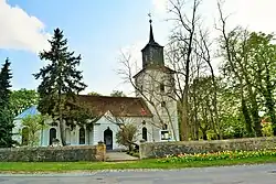 Die Dorfkirche wurde erstmals 1541 urkundlich erwähnt. Das Kirchenschiff mit Rundbogenfenstern wurde 1824 errichtet, geht jedoch auf einen Vorgängerbau zurück. Der quadratische Turm stammt im Kern aus dem Jahr 1738, wurde aber 1851 grundlegend erneuert. Die Apsis wurde erst 1889 ergänzt. Es handelt sich um einen verputzten Massivbau mit gequaderten Ecken. Der Turm ist teils als Fachwerk ausgeführt.