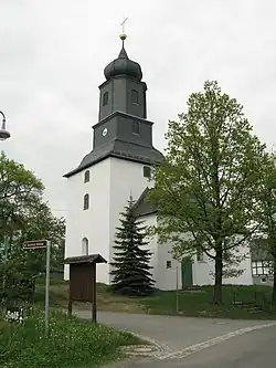Die kleine Saalkirche entstand vermutlich um das Jahr 1400. Veränderungen und Umbauten wurden in den Jahren um 1700 und 1786 vorgenommen; der überdimensionale Turm wurde 1745 erbaut. Restaurierungen erfolgten in den Jahren 1935, 1951 und 1977/78; bei der letzteren wurde die Raumfassung des späten 18. Jahrhunderts freigelegt. Das Bauwerk ist ein verputzter Bruchsteinbau mit geradem Schluss. Der Westturm ist in Saalbreite über quadratischem Grundriss erbaut, der verschieferte Abschluss endet in einer Welschen Haube mit Laterne und Zwiebel. Das Innere ist von einer malerisch barocken Wirkung; an der flachen Decke sind geometrische Felder des 17. Jahrhunderts aufgelegt. Der Raum wird von eingeschossigen Emporen des 17. und 18. Jahrhunderts eingefasst, deren Brüstungen im 18. Jahrhundert ornamental bemalt wurden und an der Ostseite mit rustikalen Schnitzereien verziert sind.