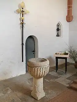 Die Decke im Saal ist durch feine Stuckleisten gegliedert. Im Süden und Westen sind zweigeschossige Emporen angeordnet. An der Wand neben dem Triumphbogen wurden mittelalterliche Wandmalereien freigelegt. Die aus dem 13. Jahrhundert stammende Sakristei ist mit einem Tonnengewölbe abgeschlossen.