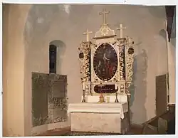 Das Altarretabel entstand Anfang des 18. Jahrhunderts und besteht aus zwei gedrehten Säulen, die mit Weinlaub und Ranken verziert sind. Die Seiten sind mit Akanthus geschmückt. In der Predella ist das Abendmahl Jesu zu sehen, im ovalen Altarblatt die Kreuzigung Jesu. Oberhalb der Säulen sowie im Altarauszug steht je ein Kreuz. Es wurde in den Jahren 1992 bis 1994 restauriert. Zwischen Apsis und Chor steht eine hölzerne Kanzel aus dem zweiten Viertel des 17. Jahrhunderts. Der Kanzelkorb ist mit gedrehten Säulen verziert; dazwischen sind Bilder der Evangelisten.