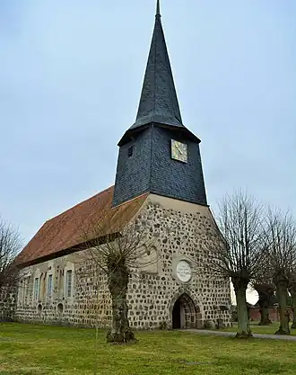 Die Feldsteinkirche wurde in der zweiten Hälfte des 13. Jahrhunderts erbaut. Der querrechteckige Kirchturm im Westen des Langhauses wurde nicht in Feldsteinen ausgebaut, sondern 1601 mit einem schiefergedeckten quadratischen Dachturm vollendet, auf dem ein achtseitiger Knickhelm sitzt. Die Sakristei im Nordosten des nicht vom Langhaus abgesetzten Chors gehört zum ursprünglichen Baubestand. Der Anbau auf der Südseite wurde für ein Portal errichtet.