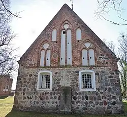Der Ostgiebel ist aus Backstein mit drei Maßwerkblenden gestaltet. Das Innere ist mit einer Balkendecke geschlossen; der Dachturm ruht auf zwei Holzstützen.