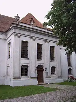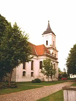 Das Kirchengebäude wurde 1756 vermutlich nach Plänen des Baumeisters C. H. Dehne im spätbarocken Stil errichtet. Es entstand ein weiträumiger Putzbau, dessen rechteckigem Kirchenschiff kurze risalitartige Querflügel angefügt sind. Die Außenwände sind mit einer zweireihigen Fensterfront versehen, in der oberen Reihe hohe, darunter niedrige Stichbogen- oder rechteckige Fenster. Die Ostwand und die Querflügelfronten sind mit toskanischen Pilastern und Attiken geschmückt. Die Walmdächer des Kirchenschiffs und der Querflügel sind mit roten Ziegeln deckt. Der dreigeschossige quadratische Turm trägt eine flache Schweifhaube, der eine achteckige Spitze aufgesetzt ist.