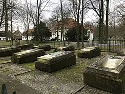 An der äußeren Südwand erinnern drei Epitaphe an den 1609 verstorbenen Joachim von Leipzigk, den um 1660 verstorbenen Christian von Leipzigk sowie eine 1590 verstorbene Frau. Neben dem Chor befindet sich die Erbbegräbnisstätte der Familie von Arnim. Die Tumben sind gleich gestaltet, mit Kalksteinplatten sowie bronzenen Wappenreliefs verstehen. Die Grabanlage wurde beginnend im April 2012 restauriert. Dabei wurden Schäden im Betonsockel und dem Metallgitter behoben.[2]