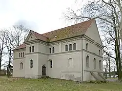 Das Bauwerk wurde im Wesentlichen aus Feldsteinen errichtet, die anschließend verputzt wurden. Der Bau hat einen rechteckigen Grundriss; die Ostwand ist gerade. Dort sind im unteren Bereich zwei große Rundbogenfenster, dessen Faschen durch einen verputzten Schlussstein nochmals betont werden. Darüber ist ein umlaufendes Gesims, oberhalb kam beim Umbau in den Jahren 1894/1895 ein Mezzanin-Geschoss hinzu. Das Ostfeld ist mit Lisenen gegliedert, darin je ein kleineres Rundbogenfenster sowie am Übergang zur Dachtraufe ein nach unten geöffneter Fries.