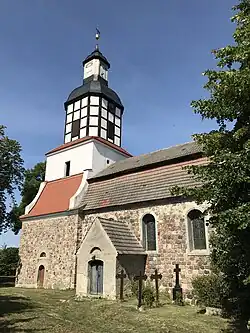 Im Westen schließt sich der Kirchturm an. Er ist ein wenig breiter als das Schiff und entstand aus wenig behauenen und nicht mehr lagig geschichteten Feldsteinen. An der Westseite ist eine Rundbogenpforte, die mit einer Fasche betont wird. Der Bogen ist aus rötlichem Mauerstein errichtet. Oberhalb ist ein halbkreisförmiges Fenster, darüber ein Ochsenauge, ebenfalls in Mauerstein eingefasst. An der Nord- und Südseite befindet sich je eine weitere Pforte, darüber ein halbkreisförmiges Fenster. Darüber erhebt sich in barocken Formen das Turmgeschoss. Der Giebel ist hell verputzt, an den drei zugänglichen Seiten ist je eine hochrechteckige Öffnung. Darüber erhebt sich ein achteckiger Aufsatz aus Fachwerk. An allen vier Seiten ist je eine Klangarkade, die im Osten und Westen durch eine darüberliegenden Turmuhr ergänzt wurde. Oberhalb einer geschweiften Turmhaube erstreckt sich ein kleiner Turmhelm, der mit Turmkugel und Wetterfahne abschließt.