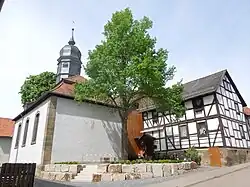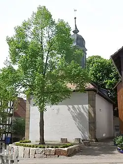 Die 1717–1718 an der Stelle einer bereits im Jahre 1316 erstmals erwähnten Sankt Matthäi Kapelle erbaute und 1999 aufwändig sanierte Kirche in der Mitte des Dorfes, mit Mansarddach und barockem Dachreiter-Glockenturm. Auf den Emporen wurden im Barock emblematische bildliche Darstellungen und Zitate nach Vorlage der „Emblemata sacra“ des Daniel Cramer aufgebracht.[10] Ein Leben und Sterben unter christlichen Ideen spielt bei allen Emblemen eine zentrale Rolle. Auch die Kirchenbänke fallen farblich aus dem üblichen Rahmen; sie sind marmoriert, und ihr Farbenspektrum reicht von dunkelbraun über rotbraun bis flaschengrün. Viele Bänke tragen noch heute die Namen der Familien, die früher auf ihnen ihren angestammten Platz hatten. Alle Malereien an den Ausstattungsstücken wurden 1964 überarbeitet. Die Wandmalereien an der Kopfwand und der Fensterseite wurden erst 1975 bei der Sanierung der Bausubstanz unter dem Kalkputz entdeckt und dann restauriert. Weitere Malereien befinden sich unter dem weißen Anstrich der Decke und erwarten ihre Freilegung und Restaurierung.