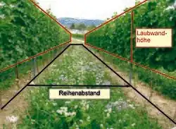 Die Laubwandfläche (die Behandlungsfläche) wird von einem Hektar mit dem Reihenabstand und der Laubwandhöhe berechnet:[8]