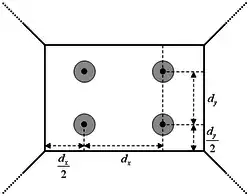 Durch die Platzierung der Tieftöner an der Vorder- und Rückseite des Raumes in einem Gitter mit einem bestimmten Abstand zueinander werden die Moden zwischen den Seitenwänden und Boden bzw. Decke nicht angeregt. Die Tieftöner müssen dabei auf der Wand nach folgenden Formeln platziert werden: