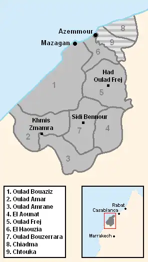 Die meisten Bewohner der Region Doukkala sind berberischer Abstammung. Man spricht jedoch zumeist Marokkanisches Arabisch. Größte Städte sind El Jadida (auch Mazagan; ca. 200.000 Einwohner) und Sidi Bennour (ca. 60.000 Einwohner)[1]. Lebten am Ende der Protektoratszeit ca. 400.000 Menschen in der Region Doukkala, so sind es heute knapp 3 Millionen, die sich größtenteils auf 7 Stammesgruppen verteilen: