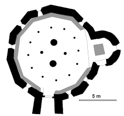 Im Kapellengrundriss fallen zwei Anbauten auf, die die Gleichmäßigkeit der Anlage durchbrechen: die kleine Eingangshalle und der Chorraum. Beide sind auffallend gegen die Symmetrie des Gesamtgebäudes gerichtet. Die Vorhalle ist in sich asymmetrisch, der Chor verfehlt die Ausrichtung auf die Kapellenmitte deutlich. Die an der Außenwand umlaufende Steinbank zeigt im Anschlussbereich an den Chorraum auf ihren beiden Seiten deutlich unterschiedliche Ausführungen.
