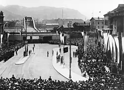 Am Sonntag, dem 9. August 1936, wurde die Brücke feierlich der Öffentlichkeit übergeben. Auf dem Gelände vor der Elbe war eine Tribüne für die Ehrengäste errichtet worden, und der Bereich war festlich mit Staats-, Aussig- sowie Schreckenstein-Fahnen geschmückt. Um 11:15 Uhr erklang die tschechoslowakische Nationalhymne. Anschließend hielten der Bürgermeister von Aussig, Leopold Pölzl, der Bürgermeister von Schreckenstein, Vincenc Řepka, sowie Ministerialrat Karel Žižka vom Ministerium für öffentliche Arbeiten feierliche Ansprachen. In allen Reden wurde betont, dass die neue Brücke nicht nur zwei Gemeinden verbindet, sondern auch als Symbol für das gegenseitige Verständnis zwischen Deutschen und Tschechen steht. Unter festlichen Fanfaren durchtrennten der Bürgermeister Leopold Pölzl das Band in der Brückenmitte. Den Abschluss bildete ein Bankett im Hotel Palace mit Vertretern der Kommunalverwaltung und am Bau beteiligten Firmen.[4][5][6][7]