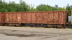 Offener Güterwagen der Bauart Eaos mit Drehgestellen der Bauart Y 25 in Ungarn