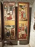 Eine historische Aufnahme ermöglicht die Rekonstruktion der Darstellungen auf den geschnitzten Innenflügeln des Retabels.[6] Auf vier Tafeln wird die Kindheitsgeschichte Jesu erzählt. Auf dem linken Flügel waren die Verkündigung an Maria und die Heilige Sippe zu sehen. Der rechte Flügel stellte die Heilige Familie vor der Krippe und die Beschneidung Jesu dar. Erhalten geblieben sind lediglich die erste und die letzte Tafel. Die Verkündigungsszene weist von der Komposition und der Ausführung her eine Ähnlichkeit zum Stil des Predellameisters vom Hauptaltar der Nikolaikirche auf.[15] Die Felder zeigen eine tiefe Raumwirkung auf. Im oberen Feldbereich sind sie vom Holzrankenwerk, im unteren Bereich vom Rankenfries verziert. Damit korrespondieren sie mit dem zentralen Aufsatz.