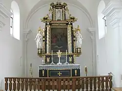 Das Altarbild stellt die Krönung Mariens dar. Der Altar wird auf das späte 17. Jahrhundert datiert. Er enthält zwei gedrehte und mit Reben umwundene Säulen im sogenannten Knorpelstil. Die seitlichen Holzfiguren stellen St. Jakob und einen Pilger dar. Im Altarauszug steht die Holzfigur des Salvator mundi in weißgoldener Fassung.