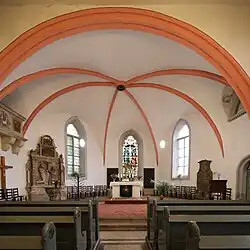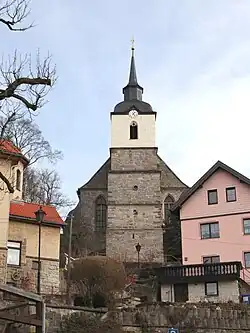 Das 16 Meter lange und 12 Meter breite Langhaus der Saalkirche hat ein Satteldach und eine Flachdecke mit abgeschrägten Kanten sowie eine zweigeschossige Empore an drei Seiten. Es ist durch einen rundbogigen Triumphbogen vom polygonalen Chor getrennt. Der Chorraum wird von einem sechsteiligen Kreuzrippengewölbe überspannt. Das Mauerwerk des Kirchturms ist durch horizontale Gesimse gegliedert. Den oberen Abschluss bildet ein Schweifdach und eine Laterne mit spitzem Helm. Die Sakristei steht auf der südlichen Seite in einem kreisrunden Anbau, der vermutlich Rest eines Turmes des Burgbergringes ist. Ein kreisrunder Anbau auf der nördlichen Seite erschließt die Herrschaftsloge.