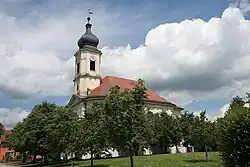 Friederike Luise von Preußen, nachdem sie sich in Unterschwaningen zurückgezogen hatte, beauftragte Leopoldo Retti, eine Kirche zu bauen, zur Ausführung kam allerdings 1738–43 die barocke Predigtkirche nach Plänen von Johann David Steingruber im Markgrafenstil. Sie besteht aus einem Langhaus mit abgerundeten Ecken, einem eingezogenen, querrechteckigen Chor im Nordosten und einem Fassadenturm im Südwesten, der vollständig in das Langhaus eingestellt, und dem ein Risalit mit dem Portal vorgelagert ist. Das oberste Geschoss des Fassadenturms beherbergt die Turmuhr und den Glockenstuhl. Darauf sitzt eine schiefergedeckte Zwiebelhaube. Die Längsseiten des Langhauses haben doppelstöckige Emporen. Zur Kirchenausstattung gehört ein Kanzelaltar in einer Nische in der Stirnwand. Die Orgel mit 17 Registern und einem Manual wurde 1743 von Friedrich Sigmund Prediger[1] erbaut.