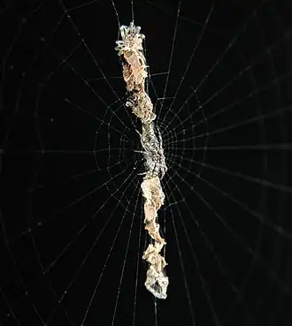 - ↑ a b c d Wiki der Arachnologischen Gesellschaft: Cyclosa oculata (aufgerufen am 9. Februar 2020)