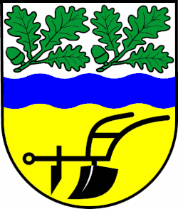Blasonierung: von einem blauen Wellenbalken geteilt, auf Silber nebeneinander 2 grüne Eichenzweige mit 3 Blättern und 1 Eichel und auf Gold ein räderloser schwarzer Pflug.