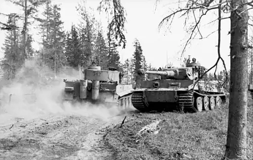 Panzerkampfwagen VI „Tiger“ der schweren Panzerabteilung 502 nahe Mga (August 1943). Die wenigen Panzer wurden als „Feuerwehr“ an den Brennpunkten der Front eingesetzt.