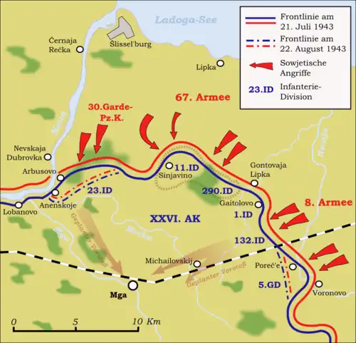 Die Rote Armee begann dabei am 22. Juli 1943 eine Offensive zum vollständigen Entsatz des landseitig eingeschlossenen Leningrads gegen die Heeresgruppe Nord der Wehrmacht. Ziel war es, die Schienenverbindung zur Metropole, besonders aber den Eisenbahnknotenpunkt Mga mit den vorgelagerten Sinjawino-Höhen einzunehmen. Bis zum Ende der Operationen am 25. September 1943 konnte sie nur geringe Teilerfolge erringen, erlitt jedoch, wie auch die deutsche Seite, hohe Verluste. Das operative Ziel der sowjetischen Armeeführung wurde nicht erreicht. Die deutschen Verbände konnten sowohl den strategisch wichtigen Höhenzug als auch die Siedlung Mga halten. Allerdings trafen die Verluste die deutsche Seite dabei im weiteren Verlauf härter als die sowjetische.