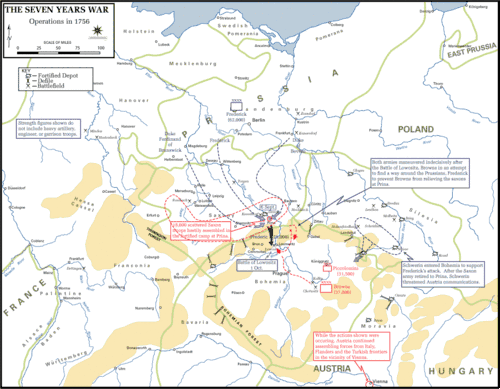 Mit dem am 29. August 1756 – ohne Kriegserklärung – erfolgten Einmarsch preußischer Truppen in Sachsen und der drei Tage später beginnenden Einschließung der sächsischen Armee bei Pirna begann der Krieg auch auf dem europäischen Festland.