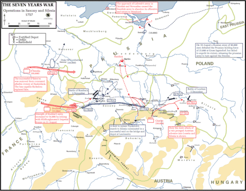 Friedrich II. nahm sein strategisches Konzept des Vorjahres noch einmal auf, zunächst Prag einzunehmen und so einen entscheidenden Schlag gegen Österreich zu führen. Im April rückten die preußischen Truppen von mehreren Seiten in Böhmen ein, wo es am 6. Mai 1757 zur Schlacht bei Prag kam. Zwar siegten die Preußen, doch ein Großteil der österreichischen Armee rettete sich in die Festung. Während Friedrich mit der Belagerung derselben begann, zog von Süden her ein österreichisches Entsatzheer unter Feldmarschall Graf Daun heran. Friedrich II. stellte sich diesem mit der Hälfte seiner Truppen (die andere belagerte Prag) in der Schlacht von Kolin am 18. Juni entgegen und wurde schwer geschlagen. Als Folge dieser Niederlage mussten die Preußen ganz Böhmen räumen und nach Sachsen zurückweichen. In den folgenden Monaten manövrierten die gegnerischen Heere ergebnislos umeinander, bis Friedrich II. durch den Anmarsch der Reichsarmee in Thüringen gezwungen war, mit einem großen Teil seiner Truppen dorthin zu eilen. Die nunmehr überlegenen Österreicher griffen die preußischen Truppen unter dem Herzog von Braunschweig-Bevern am 7. September in der Schlacht von Moys an und zwangen sie zum Rückzug. Nach einer weiteren Schlacht von Breslau am 22. November sowie der Einnahme der Festungen Schweidnitz und Breslau befand sich Ende November der größte Teil Schlesiens wieder unter österreichischer Kontrolle. In diesem Zeitraum gelang es dem österreichischen General Andreas Hadik von Futak auch mit einer Abteilung Husaren, für einen Tag (16. Oktober) Berlin zu besetzen, bevor er sich wieder zurückzog. Anfang Dezember traf die preußische Hauptarmee unter Friedrich II. wieder in Schlesien ein. Er griff die österreichische Armee in der Schlacht von Leuthen am 5. Dezember an und schlug sie entscheidend. Diese zog sich nach Böhmen zurück, während die Preußen bis zum April 1758 die schlesischen Festungen zurückeroberten. Damit war die Ausgangssituation vom Beginn des Jahres weitgehend wiederhergestellt.
