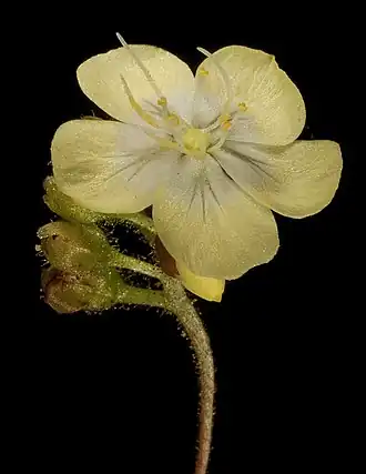 Die ein oder zwei Blütenstände sind bis zu 4 cm lang und dicht mit winzigen Drüsenhärchen besetzt. Der Blütenstand ist ein Wickel aus 12 oder mehr Blüten an rund 2,5 mm bis 3 mm langen Blütenstielen. Die eiförmigen Kelchblätter sind 2 mm lang und 1,2 mm breit. Die Oberfläche ist vereinzelt mit Drüsen besetzt. Die zitronengelben Kronblätter sind an der Basis weiß, eiförmig, 5 mm lang und 3,5 mm breit.