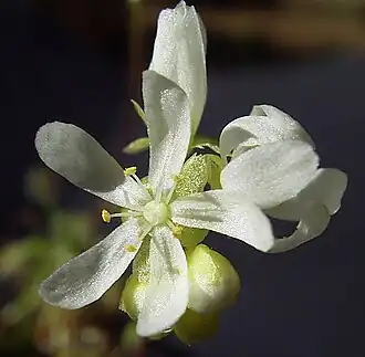 Am bis zu vier Zentimeter langen Blütenstängel stehen vier bis zwölf weiße oder pinkfarbene Blüten mit einem Durchmesser von knapp einem Zentimeter. Die fünf Kronblätter sind relativ schmal (3 mm lang und 1 mm breit). Die Blüte kann bis zu 3 Tage durchblühen (schließt sich auch bei Nacht nicht) und hat einen süßlichen Duft. Blütezeit ist September bis Oktober (also im australischen Frühling).